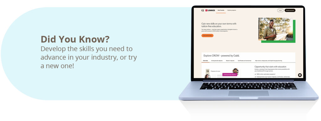 To learn more and begin the application process, please visit Lennox.GuildEducation.com and log in with your Lennox employee credentials. Click here to see program FAQs.